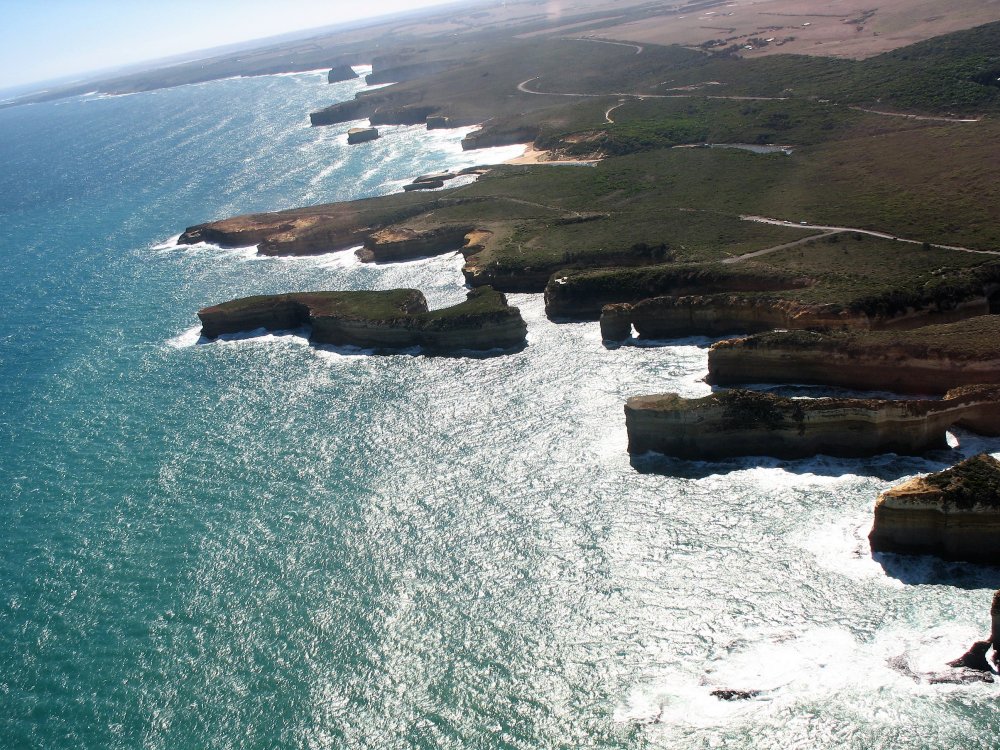 Vi fik et spændende og extraordinært tilbud. For 90 AUD kunne vi komme op og flyve helikopter langs kysten i 10 min. Det ku' vi ikke sige nej til. Vi var 4 i helikopteren og en pilot og det var noget af en oplevelse - helt vildt spændende, men 10 min går alt for hurtigt her. Var forbi nogle drypstensgrotter, der ikke var imponerende, når man har set Postojna grotterne i Slovenien. "London Bridge" stod i mange år og lignede en flot bro, men klipperne styrtede i havet i 1990. Dagens tur på 535 km sluttede først på aftenen. Aftensmaden på en hyggelig kinesisk restaurant inden vi tog hjem på taget af vort hostel og nød en cola og lidt snoller. Stadig var vi nok i den ældste kategori på hostel, men det var vi jo vant til.