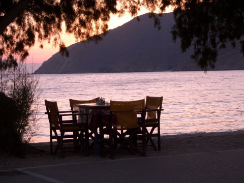 Desværre betød den hyggelige stemning også, at vi blev forsinkede i forhold til vores aftale med Nikkeren og Øresneglen inklusive deres frie viljer, som vi skulle dinere sammen med i anledning af den forestående afrejse. Sulten var ikke overvældende med vi delte en fortræffelig Ged i tomatsovs og smagte nogle af de helstegte Små Fisk, som dog ikke var så små endda. Og for at slå sømmet helt i, bød Leftheris på Raki fra klosteret på Paros. Yderst velsmagende men også af en vis styrke, som sammen med et glas retsina kunne virke søvnfremkaldende.
